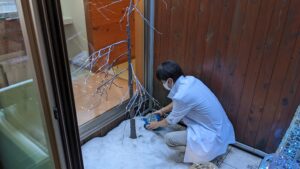 クリニックの中庭にはアンパンマンのキャラクター達がいます。クリニックの屋根は斜度が大きくて屋根に積もった雪がドッサリと落ちてくるのです。